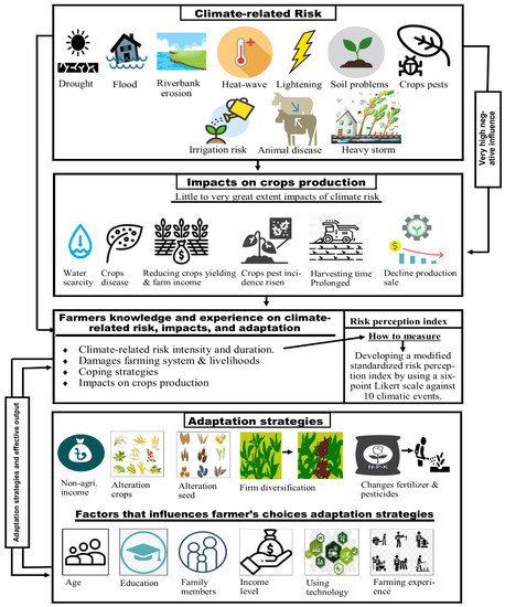 Many approaches have been used in the existing literature to gain insights into climate-related risk perceptions. Of these, most studies have focused on measuring risk perception of climate change from their own experiences and through different factors, including social, cultural, and psychological, by using Likert scales [2,38,39,46]. The Likert scale is broadly utilized in behavioral studies that help to develop relative insight scales. In this study, we also adopted a Likert scale to measure farmers’ risk perception of climate change. In such a manner, the perception output is expressed by index-based values. These index values are defined by a modified climate-related risk perception score (CRRPS) and the modified climate-related risk perception index (CRRPI) to inspire a superior understanding of how farmers perceive climate-related risks and impacts (Section 3.5). Such climatic risks include crop pests, irrigation risks, animal diseases, etc., which adversely affect water availability, reducing crop yields and farm income, and increases crop pests (Figure 1).