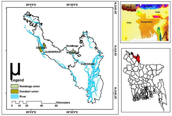 The present study was performed at the Phulbari and Hatibandha Upazilas in the Kurigram and Lalmonirhat districts of the northern region of Bangladesh, respectively. The area is geographically situated within 25 adaptation strategies. suste and 89°0′0″ E to 89°3′0″ E longitude (Figure 2). Then, four villages from these two Upazlias were selected for data collection while considering three aspects: (i) these villages, situated on the bank of the Teesta and Dharla Rivers, are highly vulnerable to flooding, and every year enormous floods occur in this area; (ii) the levels of severity of riverbank erosion that was recognized through an extensive review of the reports in newspapers and in consultation with local-level field experts; and (iii) the intensity of heatwaves and droughts in the dry period that was acknowledged by the review of a scientific journal and discussion with local people [37]. Char Gorok Mondol and Asiyar Bazar of Phulbari Upazila, East Daoabari, and North Daoabari of Hatibandha Upazila were selected for this research based on the aforementioned aspects.