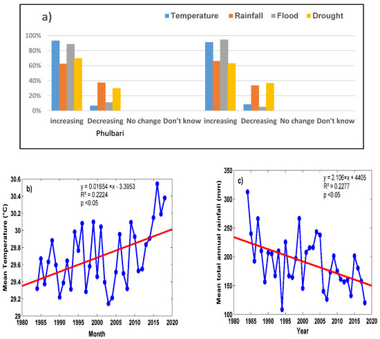 (a) Farmers’ perceptions of temperature, rainfall, flood, and drought changes in last 30 years (source: field survey, 2020); (b) observed annual mean temperature; and (c) observed mean total annual rainfall (mm) trends in the study area in 1984–2018 from the Rangpur observation station of the Bangladesh Meteorological Department, 2020.
