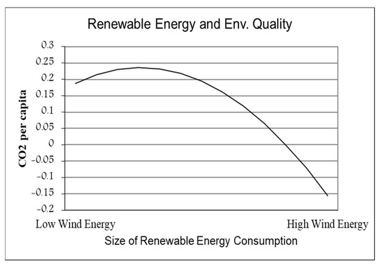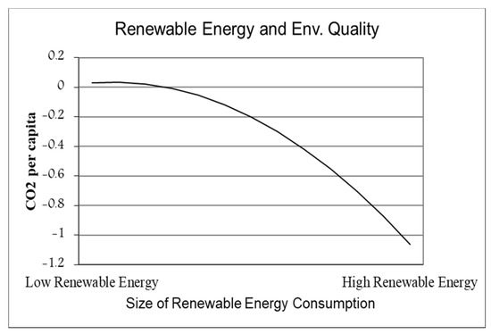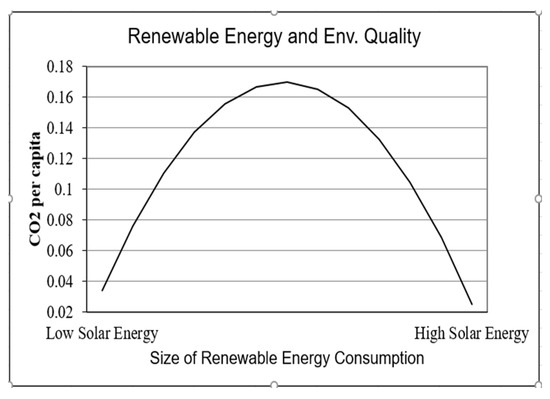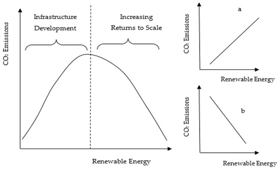 Lastly, when several renewable energy production ventures are being developed in the country and are in different stages of development or energy production, then an increase in energy production from renewable sources at the national level will follow the inverted U-shaped pattern as shown in Figure 2, because this opposite effect of increasing and decreasing CO2 requires optimization to produce renewable energy to at least reach a level where it offsets the CO2 emitted from the projects which are under development. In order to estimate the U shaped pattern, this study had used the quadratic transformation of renewable energy indicators. This quadratic transformation will provide the average linear and curvilinear effect [60]. However, the exact shape of the curve also depends on the incidence (mean and standard deviation) of the independent variable [61].