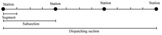 This paper involves several appellations of the railway sections. Here we give the definition. Dispatching section (or “section” only) refers to a section including some stations and segments, which is a unit for dispatching work. Segment refers to the subsection between two adjacent stations. A segment is divided into several segments because of the different longitudinal section and horizontal section by the turning points of the rail. We call the smallest unit of the section a segment, see Figure 2. We will study the train re-scheduling problem, determining the arrival and departure time of the trains at stations. We will also calculate the speed of the trains at the beginning and end of each section, controlling the movements of the trains, which belongs to the train control level.
