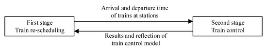 It is obvious that two problems must be solved when dispatching the trains on the railways, which are closely tied to each other. Re-scheduling is to adjust the order of the trains to run through the stations and the arrival and departure time of the trains. The task of control is to adjust the speed of the trains to arrive at the stations in time. Therefore, it can be concluded that the results of train re-scheduling problem (arrival and departure time of the trains at stations) are the base and constraints of the train control problem, requiring the arrival and departure time of the trains. Based on the characteristics analyzed above, we designed a bi-stage model to solve the train re-scheduling and control problem, see Figure 3.