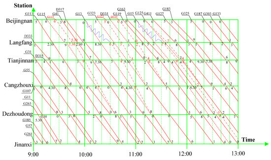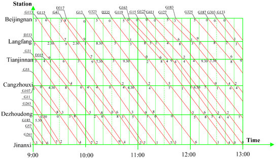 Re-scheduled train diagram between Beijingnan and Jinanxi (south-going direction) from 9:00 to 13:00.