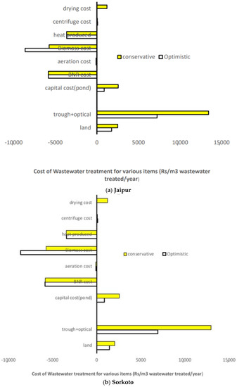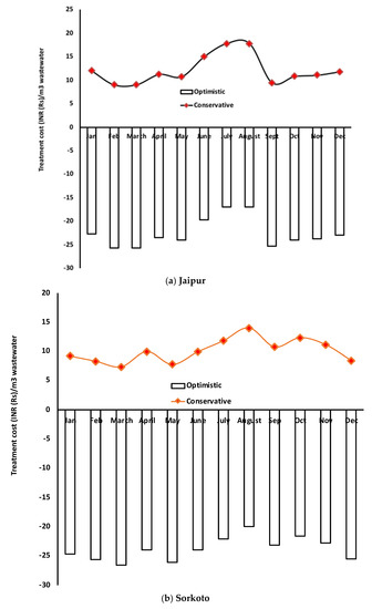 Sorkoto, Nigeria: The cost of the wastewater treatment in Sorkoto showed a similar trend as in Jaipur. However, the cost of the treatment is lower than that estimated in Jaipur. In the conservative scenario, the cost of the treatment varied from 3 INR to 7 INR (per m3 wastewater treated per day). In contrast, in the optimistic scenario, the treatment unit registered profit, and profit varied from 19 INR to 27 INR for treating 1 m3 wastewater/day (Figure 3b). It was also observed that in the optimistic scenario, an increase in wastewater flow from 1000 m3 (conventional scenario) to 10,000 m3 was observed. The capital cost of the unit (1000 m3/day capacity) was estimated to be varied between 11–14 crores ($1.5 million–1.9 million) depending on the scenario.
