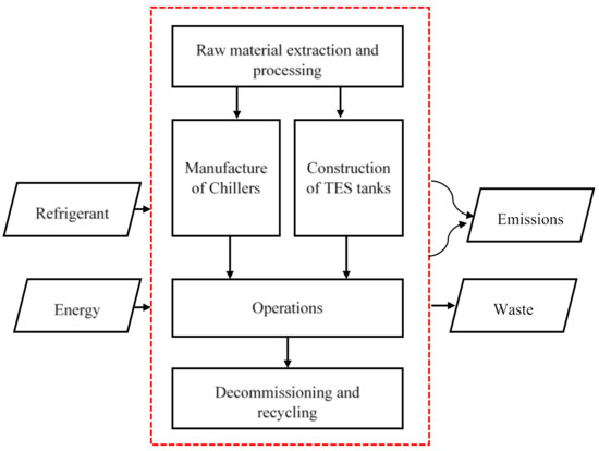The upstream and downstream of the VCS life cycle are covered by the system boundaries considered in this study. The chiller plants and the TES tanks are estimated to have a 25-year use life. In this study, the rule for setting the system boundary consists of three decision criteria for each candidate component: unit process, mass, and energy contributions to the entire plant. In detail, a selected unit process must have a significant contribution, for example, higher than 5% of the entire product, to at least one decision criterion. Once the main unit processes are selected, the major materials involved in each unit process are chosen based on the “cut-off” result. The EcoInvent database and literature are primarily used to gather information for the upstream and downstream life cycle impact assessments. On a global scale, system boundaries are established at the RoW (rest of the world) level. The system model “Cut-Off” was chosen for all EcoInvent data. Generic datasets of firms from EcoInvent are utilized for particular procedures. The EcoInvent database categorized the datasets as “global average” [18].