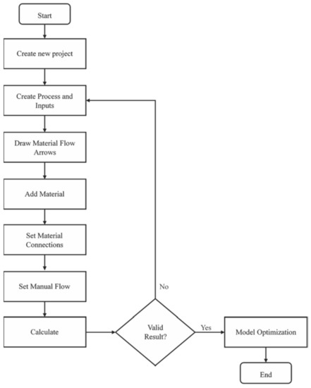 In fulfilling the objectives of this study, an LCA model was developed in the Umberto LCA+ software. The flowchart for the modelling process is outlined in Figure 4. The complete system modelling in Umberto LCA+ software is shown in Figure 5.