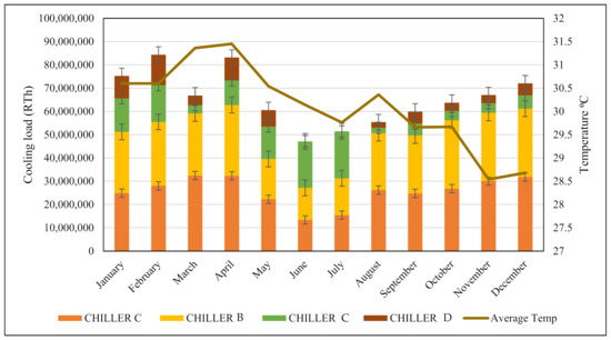 The mathematical formulation to estimate the cooling load satisfied per hour by the chillers is given by Equation (1);