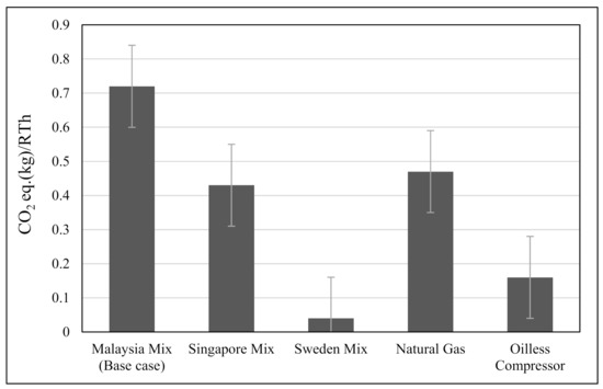 Hampo et al. [5] used a gate to gate LCA methodology to analyze the environmental performance of four electric chillers. The authors investigated the environmental performance of the chiller systems based on the composition of the 2020 Malaysia’s fuel mix and the proposed optimized electricity mix by 2030. The authors recorded an average of a 33% reduction across all the selected environmental categories, as the optimized fuel mix option (2030) was introduced into the electricity mix.