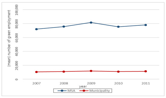 Table 1 indicates that an annual average of 11,135 green industry jobs were created in 111 local governments between 2007 and 2011, whereas on average 76,551 green jobs were generated annually at the regional level over this timeframe. In addition, Figure 1 shows the waves of green job creation in Florida metropolitan areas between 2007 and 2011. At the local and regional levels the mean value of green jobs peaked in 2009, and was followed by a wave between 2009 and 2011.