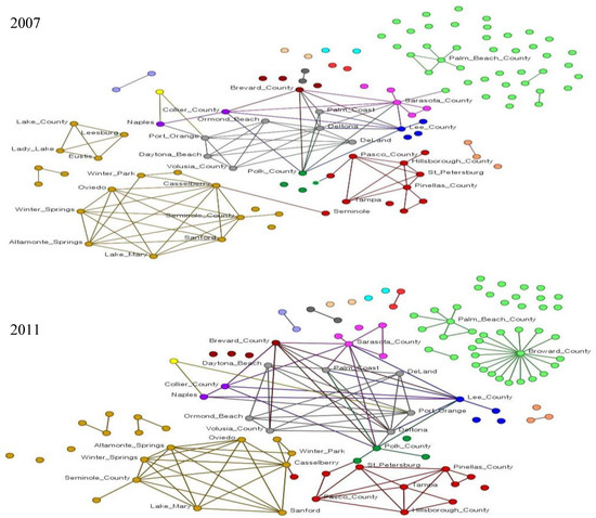 Among diverse types of collaboration, this study focuses on the formal network among local governments through the interlocal agreement, which provides the validity of time-series data for collaboration. This study collects the data for formal networks from newspaper articles in the studied timeframe, including legal notices of interlocal agreements under the Florida Interlocal Cooperation Act of 1969 (This act of local collaboration mandates that every single formal agreement between local governments be published in a newspaper). Using a systematic review process of semantic network analysis, we determined that 59 local governments (53.15%) participated in 106 interlocal agreements in 2007, and 79 local governments’ (71.17%) participated in 125 agreements in 2011. In our semantic network analysis, every word relevant to the concept of the green economy was selected using ConText version 1.0 software. Through Carley’s eight steps for building key concept lists, we finalized the network data on green economy interlocal agreements using AutoMap software. At the regional level, Table 1 shows a slight increase in the network density from 0.017 in 2007 to 0.020 in 2011, whereas Figure 2 visually depicts the overall network shapes between 2007 and 2011.