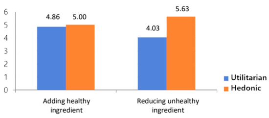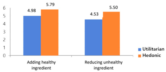 We can thus infer that a product with reduced unhealthy ingredients in a utilitarian goal activation situation and a product with added healthy ingredients in a hedonistic goal activation situation will both induce less guilt. This result can be described as the “cleansing effect”. If previous behavior was immoral, subsequent behavior tends to involve decisions designed to wash away the previous immoral behavior [9,50]. Consuming foods with an unhealthy image can be understood within the same context. In light of prospect theory from Tversky and Kahneman [51], consumers also have loss aversion, reacting more sensitively to losses than to gains. They are likely to react more to negative product-related information than to positive information. We, therefore, propose the following hypothesis, anticipating that the consumer response to goal activation will be more pronounced in the case of unhealthy ingredients than healthy ones.