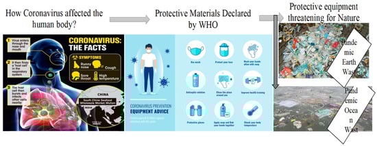 However, recent observations show that there are fewer people—especially cleaners, city workers, and community workers—who are aware of the danger of the diseases and the proper use and disposal of protective materials, such as masks and hand gloves, which creates waste in the environment. Hence, the critical events have exacerbated the new maladies, such as hepatitis and meningitis, with the recent COVID-19 pandemic [17], and these medical wastages can create bacteria, during human food consumption by several flying animals, which causes bacterial growth on human organisms [42]. Figure 1 depicts how Coronavirus affected the human body, which protective bio-medical materials—such as masks, gloves, hand sanitizer, etc.—creates the demand, and how biomedical products affect the environment caused by improper use of materials. Undeniably, the recent prices of masks, hand sanitizer, and gloves have increased suddenly and dramatically when millions of people started to use them daily. However, the demand for raw materials creates some opportunities for sustainable productions [21].