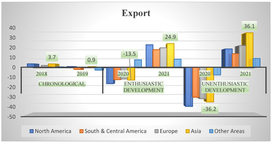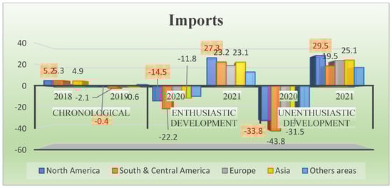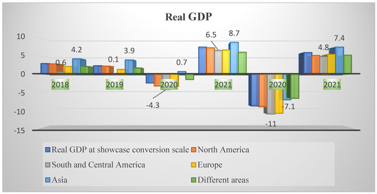 For instance, Figure 2, Figure 3 and Figure 4 depict how the pandemic affected the world product exchange volume and export, imports, and GDP in North America, South and Central America, Europe, Asia, and other continents. Exports dramatically reduced in 2020 (almost −36.2) when comparing the fiscal years of 2018 and 2019, but global economists and policymakers have anticipated that exports will increase proportionately in Asia in 2021 (36.1%), especially in the last six months of 2021, as opposed to the situation in Europe, North America, and South and Central America [78], as shown in Figure 2. Furthermore, Figure 3 depicts the chronological, enthusiastic, and unenthusiastic development of imports during the malady of COVID-19. As in 2021, South and Central America experienced dramatically decreased imports during the first six months (−22.2%) and the last six months of 2020 (−43.8%), whereas it is anticipated that the import rates will increase in North America (29.5%) followed by Asia, Europe, South and Central America, and others respectively. Alongside, Figure 4 illustrates the relationship between gross domestic product (GDP) and product exchange volume from 2018–2021. The GDP rate fell in South and Central America (−10.8), followed by Europe, North America, Asia, and other countries in 2020 during the COVID-19 pandemic. Nonetheless, it is anticipated that the GDP will climb in Asia (7.4%) in 2021 and may lower proportionally in South and Central America (4.8%). However, all over the world there is widespread concern to mitigate the environmental risks, which are associated with socio-economy and community wellbeing. Nevertheless, the manufacturing industry and power plants that halted their productions and the fewer vehicles on the roads have brought about greater positive impacts on the environment, and air pollution and greenhouse gas emissions (GHGEs) were dramatically reduced, especially in overpopulated countries [79].
