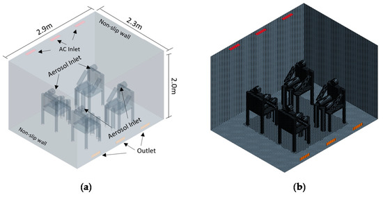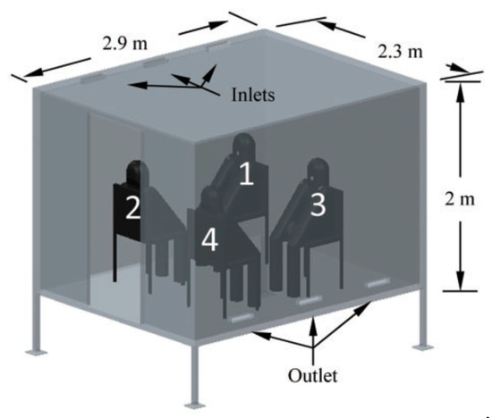 To validate the numerical models used to simulate the propagation of mouth-generated aerosol in a modular room, a study conducted by Zhang et al. [12] involving a comprehensive comparison between a full-scale experimental system and CFD simulation of an air-conditioned chamber, was used to assess the transport and the trajectory of cough-induced aerosol. The chamber geometry is 2.9 m long, 2.3 m wide and 2.0 m high, which includes four manikins sitting on chairs to simulate a gathering, as shown in Figure 2.