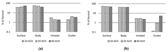 Figure 12 illustrates the impact of the ACH rate on the destination of aerosols within the computational domain. It was apparent that more particle count is exiting the outlet with higher ACH rates. The rate at which particles were exiting through the outlet increased by 41% by increasing the ACH from 10 to 20. While increasing the rate to 40 ACH yielded a 137% increase in particles leaving the outlet compared to 10 ACH. On the other hand, particles landing on equipment decreased by 19% by increasing the ACH rate from 10 to 20, while it decreased by 25% when the rate was increased from 10 to 40 ACH.