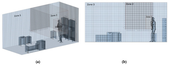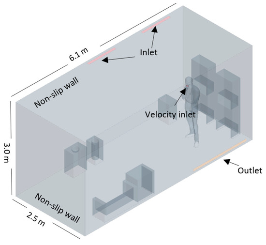 Based on these results, a similar room configuration was modelled, and boundary conditions were set as shown in Figure 4, using the flow characteristics described in Section 2 to validate the adopted numerical simulation using the reported experimental values.