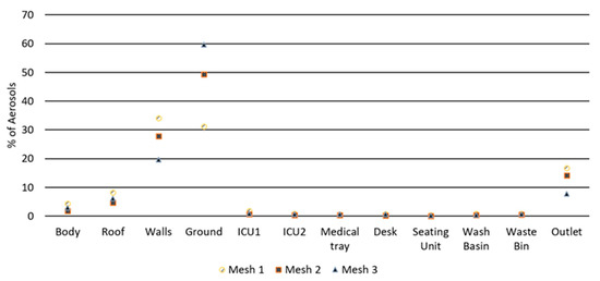 A mesh independent analysis was conducted to ensure the appropriate use of mesh sizes adopted in the simulations. Two simulations of the typical room were used with an ACH rate of 40 to conduct the mesh sensitivity analysis. The first simulation was representing coarse mesh with a base size of 75 mm, as for the fine zone, only one zone was adopted near the subject to ensure an appropriate mouth opening consistent with the original simulation. This yielded a total number of 460,000 cells. As for the finer mesh adopted, the base size used was 60 mm with two finer zones of 20 mm and 10 mm near the subject. This yielded a total of 3,860,000 cells. After processing the results, it was apparent that the mesh size adopted in the original simulation was adequate as shown in Figure 10 below. Boundary conditions across the simulation remained consistent, except for walls, ground, and outlet, this can be attributed to the mesh size being too fine or too coarse, which could cause the particles to cell skip as that violates the Courant-Friederichs-Lewy value, which ultimately alters their final position. Since the time-step remained the same across the simulation. The method of quantifying the particles near the boundary conditions depends on a surface integral function that is also linked directly to the time-step to track particles on boundary conditions. Mesh 1 represents the mesh utilized in this study, Mesh 2 represents the coarser mesh, while Mesh 3 represents the finer mesh.