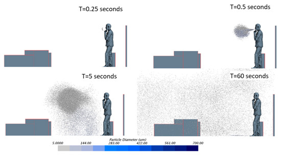 There are three governing boundary conditions of concern in this simulation, which are: the mouth, the system inlet, and the system outlet. The remaining boundary conditions are set to non-slip wall conditions, as demonstrated in Figure 8. The ventilation system inlet is located at the roof of the room with two openings with dimensions of 1000 mm × 64 mm located 80 mm away from the left wall and 610 mm away from the back wall. Openings are placed 1000 mm apart from edge to edge. The velocity of the system inlet was calculated based on the ACH rate. In this case, 10, 20, and 40 ACH required velocities of 1.02 m/s, 2.04 m/s, and 4.08 m/s, respectively. The inlet was adjusted to be inclined downward at an angle of 30° from the horizontal plane. The ventilation system outlet is located on the right wall with dimensions of 2000 mm × 64 mm and placed 80 mm away from the floor and 190 mm away from the back wall. The outlet boundary condition was set as a pressure outlet with negative pressure calculated using the inlet velocity and the air density of the room to maintain constant air mass within the room. The suction pressure at the outlets was set to −0.62 Pa, −2.47 Pa, and −9.88 Pa for 10, 20, and 40 ACH, respectively. Figure 11 illustrates the distribution of the particles and their propagation over time for the ventilation case of 40 ACH.