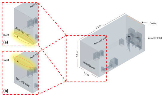 In the first case (a), the inlet is located at the roof of the modular room at 80 mm away from the front wall and shaped as a rectangular vent of dimensions 2000 mm × 64 mm. While the outlet is of the same dimension and is 80 mm away from the back wall. In the other case (Case b), the inlet is located at the front wall and consists of 2000 mm × 64 mm and 80 mm above the floor, while the outlet remains at the same position. Both cases involve the study of the effect of ACH rate on contaminants removal.