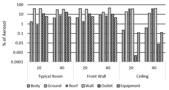 After running the models, the model with the inlet at the ceiling performed the worst due to having less impact on the particles as less than 1% of particles ended at the outlet in both the 20 and 40 ACH cases. 5.7% fewer particles landed on the ground when the ACH rate changed from 20 to 40, due to the increasing suction. And since particles are required to travel further in this orientation, fewer particles were removed from the system. While the case of having the inlet at the front wall yielded the removal of at least 11% in both 20 and 40 ACH, and 22.8% reduction in particles landing on the ground when the ACH rate increased from 20 to 40 as demonstrated in Figure 14, and this can be attributed to the location of the inlet, as it can directly impact the aerosols lifting them away from the ground towards the outlet. As for the overall performance of the different configurations studied, the typical room performed the best in terms of particles exiting the domain with the removal of 11.8%, and 16.7% of aerosols through the outlet in the cases of 20 and 40 ACH, respectively. As for particles landing on the walls, the typical room observed to have decreased from 40% to 34% in the cases of 20 and 40 ACH, respectively, unlike the other configurations, where increasing the ACH rate yielded increased aerosols on walls. This can be due to having aerosols travel further in the domain, which increases the chance of particles landing on other surfaces between the inlet and the outlet.