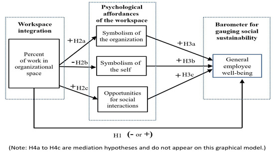 Hypotheses 2a, 2b and 2c connect workspace integration to the psychological affordances of symbolism and opportunities for social interactions. Viewing the features of a workspace as affordances [37] is useful as a foundation for linking workspace features with employees’ general wellbeing (e.g., [52]).