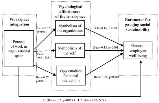 Our goal in this paper is to connect workspace design to employee wellbeing and social sustainability. Toward this connection, we introduce and empirically test a new concept of “workspace integration”. This concept refers to the continuum of integration of an employee’s workspace with the organizational, physical space. We further define three workspace affordances that predict the social sustainability of workspace arrangements by influencing employee wellbeing. The three affordances are perceptions of symbolism of the organization and of symbolism of the self, and opportunities for social interactions. We evaluate our theory using data collected from an online survey of British employees (n = 392) working in offices at home and/or in the organization in various industries. As predicted, workspace integration positively influences wellbeing directly as well as indirectly via mediation of symbolism of the organization and opportunities for social interactions. The third affordance—symbolism of the self—positively influences wellbeing, but is not affected by workspace integration. Our findings confirm the impact of workspace affordances on employee wellbeing, and thus their utility for the analysis of social sustainability. The findings also contribute to understanding of the differences between workspace symbolism of the organization and of the self, their impact on wellbeing, and thus their implications for social sustainability.
