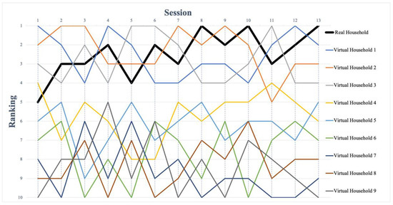 Figure 9). The black line represents the real household of the participant competing against nine other households. The scores of the top 4 ranking households, including the real household, are close to each other, and therefore should stimulate desired behavior.