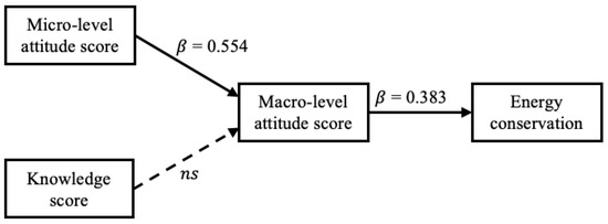 p < 0.05 indicates that this model is not adequate. There is only a significant path from Macro-level attitude to Energy conservation (β = 0.339).
