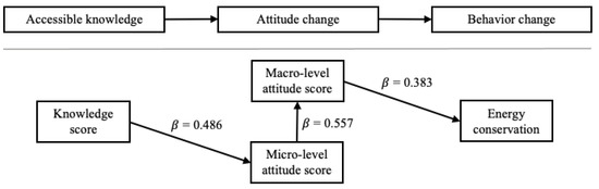 Table 7. First, accessible knowledge is related to the Knowledge score at the post-intervention. Second, Attitude change regarding Micro attitude is related to post-intervention Micro-level attitude score. Attitude change regarding Macro attitude is related to post-intervention Macro-level attitude score. Third, Behavior change is related to Energy conservation in the 21-day period after the intervention (post-intervention period).