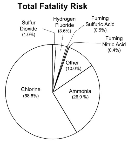 The statistics of accidents involving the transport of hazardous substances are recorded in many countries. In the US, for example, data are available from the US Department of Transportation, Pipeline and Hazardous Materials Safety Administration. The risks of transporting hazardous substances in the US were evaluated in a study conducted by the Argonne National Laboratory [17]. The objective of this study was to quantitatively characterize the risks associated with the transportation of selected hazardous substances at the national level. Based on the results obtained for TIH (toxic by inhalation) substances, it was determined that chlorine and ammonia accounted for 70% to 80% of the total risks of fatalities related to accidents in the transportation of TIH substances (see Figure 1). A comparison of fatality risks based on miles and tons of substances transported indicated that the risks of transporting LPG significantly exceeded those for gasoline, TIH and explosives (see Figure 2).