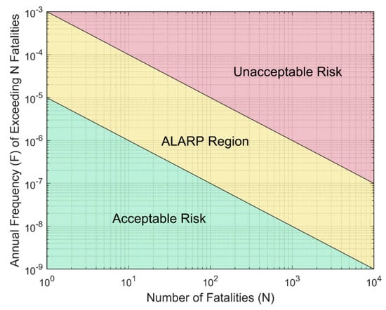 Currently, no international regulations apply to the acceptability of social risk. In single countries (e.g., UK and the Netherlands) criteria for the acceptability of social risk based on consequence/frequency curves (FN curves) are provided. As an example, in the UK, societal risk is unacceptable if FN is higher than 10−1 events/year, while an “ALARP— as low as reasonably possible” (sometimes also referred to as “as low as reasonably practicable”) region is defined for FN between 10−4 and 10−1 events/year [32]. In the Netherlands, a specific criterion applies to the societal risk generated in the transportation of hazardous substances: societal risk is considered unacceptable if FN2 is higher than 10−1 events/km year [33]. In several academic publications, the consequence/frequency curves (FN curves) are presented to summarize the societal risk deriving from scenarios generated by potential accidents, and are compared to recommended limits of acceptable risk. As an example, Tarada et al. [34] discuss the risk acceptability limits for rail transport in terms of protection objectives (see Figure 5).