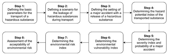 Based on the definition of the concept of an integrated approach to environmental risk assessment in the transport of hazardous substances, it is possible to proceed to the definition of a specific procedure. The essence of this procedure is to establish a clear user manual for the assessment of environmental risks in the transport of hazardous substances. It is a multi-step procedure based on the integration of the Selective Method [22] and the H&V Index II method [40] into the FMEA method [25]. The algorithm of this integrated approach is presented in Figure 7.