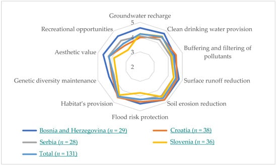 Comparing the data by country, the results show that in three countries the most important ecosystem service is soil erosion reduction (mean of 4.79 in the Federation of Bosnia and Herzegovina and Croatia, 4.53 in Slovenia), while for Serbian stakeholders, the most important ecosystem service is habitat provision (4.54).
