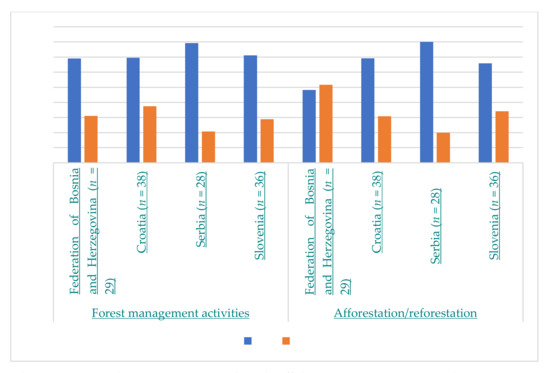 When analysing the respondents’ opinions on the trade-offs between ecosystems services, the results show that forest management activities can lead to potential trade-offs in accordance with the opinions of 70.2% of all respondents, while afforestation/reforestation activities can lead to trade-offs for 66.4% of all respondents. For respondents from Croatia, Serbia and Slovenia, both activities can lead to trade-offs between ecosystem services (from a maximum of 80.0% of Serbian respondents for afforestation/reforestation activities to a minimum of 62.5% of Croatian respondents for forest management activities). In contrast, for most respondents from the Federation of Bosnia and Herzegovina, afforestation/reforestation activities cannot cause trade-offs between ecosystem services (51.7%) (Figure 2). However, chi-square tests (χ2) show no statistically significant differences among the four countries for either activity: forest management (α = 0.01, p = 0.513) and afforestation/reforestation (α = 0.01, p = 0.076).