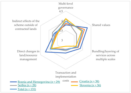 Regarding the factors related to the environmental effectiveness of PES, the results show that the most important factor is the direct changes in land/resource management (mean of 3.92), followed by the indirect effects of the scheme outside the contract areas (3.63). These results are similar in all four countries: the Federation of Bosnia and Herzegovina (4.21), Croatia (3.84), Serbia (3.82) and Slovenia (3.86). As expected, the non-parametric Kruskal–Wallis test shows no statistically significant differences between four countries for all three factors.