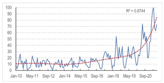 In the KNP and HNP, the number of tourists has shown considerable variability, while in the KMNP—which is newly established compared with the other two—the developing showplaces have attracted an increasing number of visitors, with a dynamic 600% growth between 2011 and 2019. In 2020, official figures showed a significant drop in all three national parks, up to 80%. However, according to the national park experts interviewed, this was only due to the restrictive measures, as visitors to protected areas were not registered because guided tours were not possible for a large part of 2020. Their view is confirmed by Google Trends data on Hungarian internet searches for the term “nature trail”, which was at a record high in 2020, and this upward trend continued in 2021 (Figure 2).