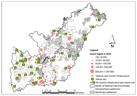 As a further aspect, we also assessed the data of beneficiary settlements. We found that only one-fifth of the tourist facilities and trails of the three national parks are located in such municipalities (13 out of 166). This raises the question of how much these facilities and trails can help the development of rural municipalities with employment problems and other disadvantages.