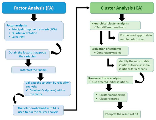 Cluster Analysis (CA) started by applying five hierarchical methods based on the variables that resulted from the FA (scores saved as variables): (1) average linkage—between groups, (2) average linkage—within groups, (3) complete linkage—furthest neighbor, (4) centroid and (5) Ward. In all cases, it considered the measure for interval by the squared Euclidean distance. Based on the agglomeration schedule, it was possible to identify the most adequate number of clusters. Then, those five solutions were compared for similarity using contingency tables, which allows inferring about possible stability.