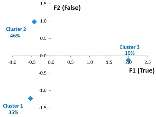 The compatibility between the solutions obtained with the five hierarchical methods, when the number of clusters was fixed as three, was checked though contingency tables, and these results are presented in Appendix A (Table A1). The values of the percentages indicated that the solutions obtained by all the methods converge to a single solution, i.e., the percentage of the cases allocated to the same clusters is the maximum. These results confirm that the ideal number of clusters is three, and that any of the five solutions tested previously were potentially stable, and therefore can be used as an initial solution to the next step, that is to apply the K-means clustering analysis. Furthermore, the application of the K-means to the five initial solutions confirmed that they all converge to a single solution, thus proving stability. The values of the F statistic in ANOVA are high for both factors (Fstatistic = 901.6 for F1 and Fstatistic = 2109.6 for F2, with p < 0.0005 in both cases), thus confirming the similarity between the cases within the groups and the differences between groups. Additionally, because both values of Fstatistic are of similar order of magnitude, they both equally contribute to the discrimination of the groups. Figure 2 shows the final cluster canters that were confirmed by the results of the K-means CA.