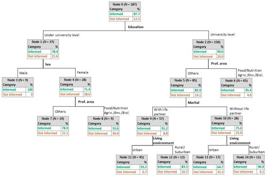 Additionally, the items used to assess the level of information about sustainability of EIs were used to calculate an average score accounting for the general level of information, and this variable was submitted to a tree classification analysis against all the sociodemographic variables in the study, to investigate their relative importance to the level of information. For this, the CRT (classification and regression trees) algorithm was used with cross-validation [37], considering a minimum change in improvement equal to 0.001 and establishing the minimum number of cases equal to 10 for parent nodes and 5 for child nodes.
