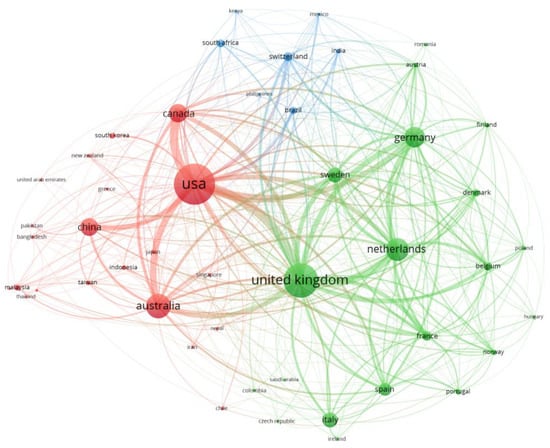 Authors from 101 countries were found to contribute to the research field, which cover all continents of the world. Table 1 lists the top 20 countries with paper outputs of over 20. The top five countries, which have the most outputs in the field are the US, UK, Australia, the Netherlands, and Germany. From the figure of national/regional cooperation network (Figure 2), we could see a network of relatively high density between countries/regions. Consistent with the conclusion that the UK and US are the leading countries in the international collaborations, the US and UK stand as the core positions in the entire network, communicating frequently with others. The US, which has published the most papers of 255 in total, cooperates closely with the UK, Canada, Australia, and China. Besides the close cooperation between the UK and US, the UK has stronger links with other European countries, such as the Netherlands, Sweden, and Germany.