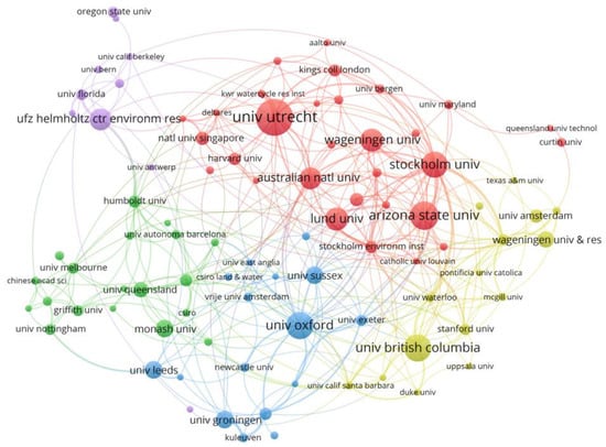 National/regional cooperation depends on research institutions to exchange knowledge with each other. As shown in Figure 3, Top 5 institutions with the most outputs in the field are University of Utrecht (The Netherlands), Arizona State University (US), University of British Columbia (Canada), University of Oxford (UK), and Stockholm University (Sweden). The actual difference in number of publications between them is small. In this intersection field, University of Utrecht published 27 papers in total, Stockholm University published 19 papers, and Helmholtz-Centre for Environmental Research (Germany) published 16 papers.