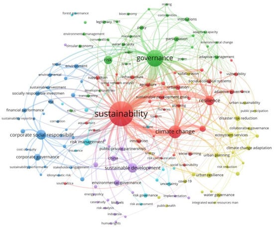 The scientometric analysis presented in this paper quantifies the scientific output of the risk governance and sustainability research, showing its interdisciplinary feature but environment-oriented. The journal “Sustainability” was found to be the most productive journal in this field. This paper visualizes author contribution spread in countries/regions, in institutions, and their collaboration networks. The US and UK are the leading countries in the research network, followed by Australia, the Netherlands, and Germany. Unlike the US, the UK has stronger links with other European countries. Five main research themes emerged from the articles, which are “Resilience and adaptation to climate change”, “Urban risk governance and sustainability”, “Environmental governance and transformation”, “Collaborative governance and policy integration”, and “Corporate governance and sustainability”. The interconnectedness of these clusters will be explained here.