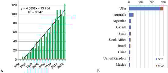Using those keywords, the search returned 1530 papers, with 1363 articles, 58 reviews, 91 proceedings papers, 10 early access papers, seven editorial materials, and one correction. A significant and positive linear relationship could be found between the number of publications in each year and the years (R2 = 0.95; Figure 1A), implying gradually increasing attention to the effect of fire on grasslands, as well as the subsequent grassland restoration and biodiversity conservation. The USA had the most publications (892 papers) on this topic, in terms of both the single country publications and multiple country publications, followed by Australia (117 papers), Argentina (54 papers), Canada (45 papers), Spain, South Africa, Brazil, China, the United Kingdom, and Mexico (Figure 1B). Additionally, about 7% of the papers (109 papers) were published in Rangeland Ecology Management, followed by Restoration Ecology (89 papers), Forest Ecology and Management (67 papers), Natural Areas Journal (41 papers), Journal of Vegetation Science, Ecological Applications, International Journal of Wildland Fire, Journal of Arid Environments, Ecosphere, and Applied Vegetation Science (Figure 1C).