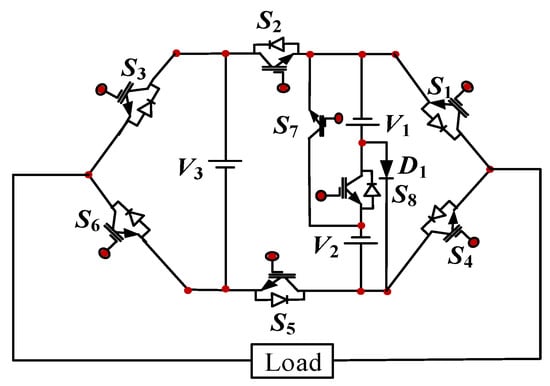 Currently, researchers are focusing on compact weight and cost-effective topologies with fewer semiconductor devices and fewer voltage sources. The cascaded H-bridge topology has failed to attract their attention because it still uses many semiconductor switches and voltage sources. The problem of many voltage sources can be minimized by applying a magnetic link-based isolated transformer; however, it produces more switching losses due to the leakage of the transformer with a low switching frequency [9]. Several reduced switch MLI topologies that have been introduced are mainly of two types: symmetric and asymmetric MLI topologies [10]. The symmetric multilevel inverter contains two parts: the level generation unit and the polarity generation unit. The level generation unit has the same number of voltage sources as the cascaded H-bridge MLI topology, while the polarity generation unit is the full H-bridge configuration. The complete design uses fewer switching devices than conventional DC MLI, FC MLI, and CHB MLI topologies. Although the symmetric multilevel inverter has partially solved the problem of using a large number of semiconductor devices, it still faces the same difficulty as the cascaded multilevel inverter, namely the use of a large number of dc sources [11]. Recently, this problem has been overcome by applying asymmetric MLI configuration. In the asymmetric configuration, different values of voltage sources are used to generate the required voltage level. This configuration uses fewer semiconductor devices and voltage sources than the symmetric configurations and the conventional cascaded H-bridge topologies.