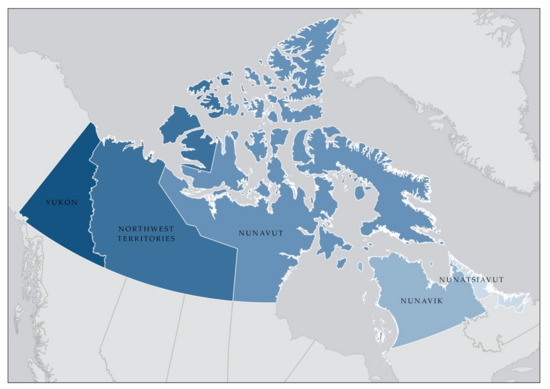 While there are many different ways to delineate the Canadian North [2,4,44,45], the geographic focus of this policy analysis includes five regions in northern Canada: Yukon, the Northwest Territories (NWT), Nunavut, Nunavik (the Inuit land-claim region in northern Québec), and Nunatsiavut (the Inuit land-claim region in northern Labrador) (Figure 1). We acknowledge that this excludes the northern provincial regions of British Columbia, Alberta, Saskatchewan, Manitoba, Ontario, Québec, and Labrador. Areas of the provincial North often face similar challenges in relation to sustainability issues. However artificial, political boundaries tend to frame policy jurisdiction, and thus, for the purpose of this study, the three territories, along with Nunavik and Nunatsiavut, were selected as our focus because they are most consistently included in pan-northern policies and publications.