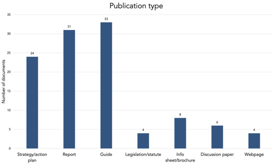 The analysis focused on several types of documents, including strategies, action plans, discussion papers, reports, guides, statutes, information brochures, and webpages (Figure 3). Some of these documents communicate internal policies, such as how an organization will support and fund research or how they will incorporate science into decision-making [1,3]. Other documents communicate guidance or expectations to external stakeholders, for example, by discussing concerns with current research practices and expectations for how research should be conducted. Some research-guidance documents outline internal policies on how an organization approaches their own research [106,107], while others provide guidance to external researchers or organizations in conducting research [108,109,110]. Most of the documents were produced from 2000 onwards (91%). This temporal scope reflects the limited availability of digital documents prior to that time period, the project focus on contemporary science policy, and the more recent emphasis by various organizations on articulating science and research policy.