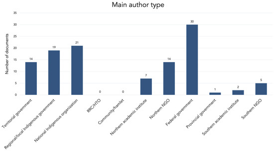 All documents were tracked according to author type (Figure 4), and any documents produced by a consultant on behalf of another organization were included in the main author type of the organization that initiated the document (e.g., NGO documents cited under the individual author’s name). Most of the documents we reviewed were produced by the Government of Canada (27%), including by POLAR, the Canadian Polar Commission, and federal advisory boards (e.g., Science Council of Canada). National Indigenous organizations produced 19% of documents, including organizations that represent and advocate for Inuit, First Nations, and Métis on the national or pan-northern scale (e.g., ITK, AFN). Regional and local Indigenous governments produced 17% of documents, including Indigenous governments, Indigenous land-claim and co-management organizations, and other northern Indigenous organizations (e.g., Sambaa K’e Dene Band, NTI, Gwich’in Renewable Resources Board (GRRB), CYFN). Documents produced by the territorial governments (13%) include policies produced by the governments of the Yukon, NWT, and Nunavut. Northern NGOs (13%) include regional and community-based non-profit organizations that are involved in research (e.g., Arctic Institute of Community-Based Research, Qaujigiartiit Health Research Centre). Northern academic institutes (6%) include the northern colleges, universities, and research institutes (e.g., Aurora Research Institute, Yukon Research Centre). Southern NGOs (5%) include documents produced by associations focused on northern research (e.g., Association of Canadian Universities for Northern Studies, International Arctic Social Sciences Association). Southern academic institutes (2%) include documents produced by research networks led by southern universities (e.g., Resources and Sustainable Development in the Arctic (ReSDA), Yukon Initiating Group of the Canadian Mountain Network). The one provincial government document (1%) was produced by the Gouvernement du Québec and relevant to Nunavik. Two groups that were identified as potential author types but did not produce policy documents included in this study include renewable resource councils/hunter and trapper organizations (RRC/HTOs) and communities/hamlets.