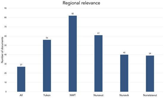 In terms of geographic coverage, half of the policy documents analyzed have a pan-northern focus, with many others having a regional focus (Table 1). Far fewer focus on the subregional level, with only one focused on the community level. Furthermore, the documents analyzed are relevant across the five northern regions (Figure 5). Of the 53 pan-northern documents, 27 were focused on all five regions and were mainly produced by the Government of Canada, southern NGOs, or southern academic networks. However, some of the pan-northern documents focused on a subset of regions, usually either at the pan-territorial scale (the three territories) or Inuit Nunangat scale (the four Inuit land-claim regions). The only region-specific document identified in this study for Nunavik was the Québec research and innovation strategy 2017–2022 [111], and none was identified for Nunatsiavut. All other documents coded to those two regions are pan-northern, either focused on all five regions or across Inuit Nunangat. Although the Inuvialuit Settlement Region (ISR) is geographically in the NWT and the Yukon, settled Inuvialuit communities are all in the NWT, so relevant documents were coded to the NWT. There are two exceptions: the documents produced by the Wildlife Management Advisory Council (North Slope), a co-management board related to the Inuvialuit Final Agreement, are specific to the Yukon North Slope region of the ISR but relevant to the Inuvialuit population in NWT and were therefore coded to both the Yukon and NWT.