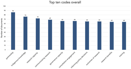 The coding process and thematic analysis identified key themes discussed throughout the documents, although diverse lenses were applied to these concepts. The most commonly identified codes include partnership, Indigenous knowledge, research capacity, communicating research, governance capacity, consultation engagement, informing policy decisions, outcomes of research, research benefits, and training (Figure 6). Partnership was emphasized most (in 86 documents), followed by Indigenous knowledge (76), research capacity (72), and communicating research (69), while the remaining codes were evenly distributed (66–64). Several codes are related to the impact that research has (informing policy decisions, outcomes of research, research benefits) or the context in which research is conducted (research capacity, governance capacity), while others focus on approaches to research (partnership, communicating research, and consultation engagement). Two of the codes were related to the steps in a research project lifecycle (informing policy decisions, communicating research), but none was from codes related to roles in research. Many of the documents reviewed discussed the role of researchers generally, without specifying specific types of researchers. There were also numerous mentions of Elders, students, local researchers, and local coordinators, yet the occurrence was much lower than codes from the other two categories.